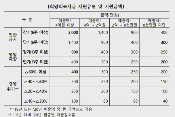 집합금지 이행기간과 매출규모에 따라서 300만원에서 최대 4,000만원까지 지원해준다.